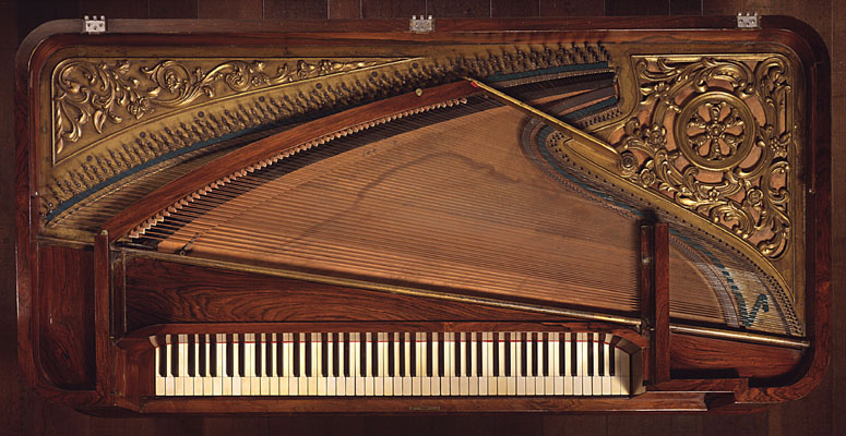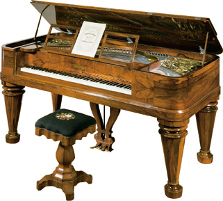 | From the early 19th century, Europeans preferred vertical pianos in the home. This instrument, made by a member of the great Stein-Streicher piano building dynasty, has six pedals and a janissary mechanism for special sound effects. |