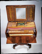 | With useful compartments and accessories, including scissors, punches, and other sewing materials, as well as a mirror in the lid, this small piano might fit in a lady's boudoir. |