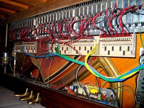 | Modern technology - electronic rather than pneumatic - witnessed a significant late 20th century resurgence of interest in the acoustic piano as a reproducing instrument. In 1977, Teledyne built an electronic solenoid operated piano playing system retrofit (replacing the old pneumatic player systems) that was sold by Sony/Superscope/Marantz. It was named Pianocorder. The Pianocorder was an electronic player piano mechanism that, by means of a digitally encoded cassette tape, could record or play a "live" performance on any piano in which it was installed (using material from the old Welte, Duo-Art and Ampico player piano roll catalogues), the output of which was fed to keyboard solenoids. Marantz used to make some of its pianos with Pianocorder installed, some without, and separate Pianocorder kits that could be installed in any piano. In 1979 Gary Burgett, a music teacher in Sacramento, CA, and his brother Kirk, a machinist and piano rebuilder, opened a store together in Nevada City, CA. In 1984 they secured the Pianocorder electronic player piano system franchise. In 1987 Yamaha acquired Pianocorder, and the Burgetts' store closed down. Almost immediately the brothers began to design and manufacture their own electronic player piano system, PianoDisc, and in 1989 they produced the first model. PianoDisc continues to thrive, retrofitting their electronic player piano system in any brand of pianos and over the years many generations of PianoDisc player systems have been introduced, each one expanding the capabilities and features of the last. When Yamaha purchased Pianocorder and its technology in 1987, they developed their own player piano system: the Disklavier. At the same time, QRS Music Technologies was developing its own player piano system, Pianomation. QRS was founded in 1900 in Seneca, PA by Melville Clark (of Story & Clark piano fame) who developed the player piano as we know it today. QRS supplied music rolls to the player piano market. In 1986, QRS began focusing on new technologies, and in 1989 released its first digital retrofit player piano kit under the Pianomation name. Today QRS is an industry leader in introducing innovations in home musical entertainment. |