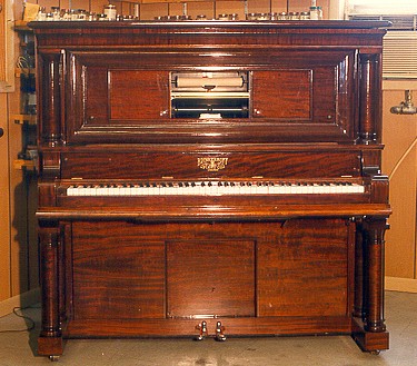 | Introduced in 1904, perhaps the most sophisticated, but expensive, form of playing mechanism was the "reproducing" piano. These pianos, unlike their upright player piano counterparts, were capable of "reproducing" the nuances of an artist's keyboard touch. After George Gershwin recorded the master roll of "Rhapsody In Blue" he stated that this roll represented his exact playing and tonal nuances. In other words, the playing mechanism was capable of striking each note with varied intensity and speed. |