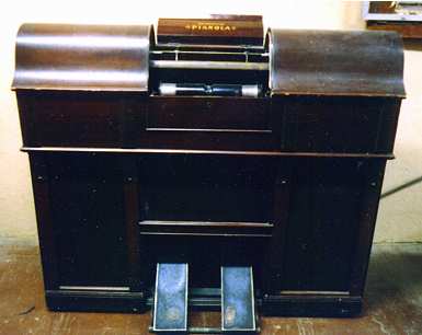 | The forerunner to the upright player piano, "the push-up" piano player was a separate mechanism and cabinet that was pushed up to piano keyboard. Wooden fingers would then strike downwards to play the piano keys. |